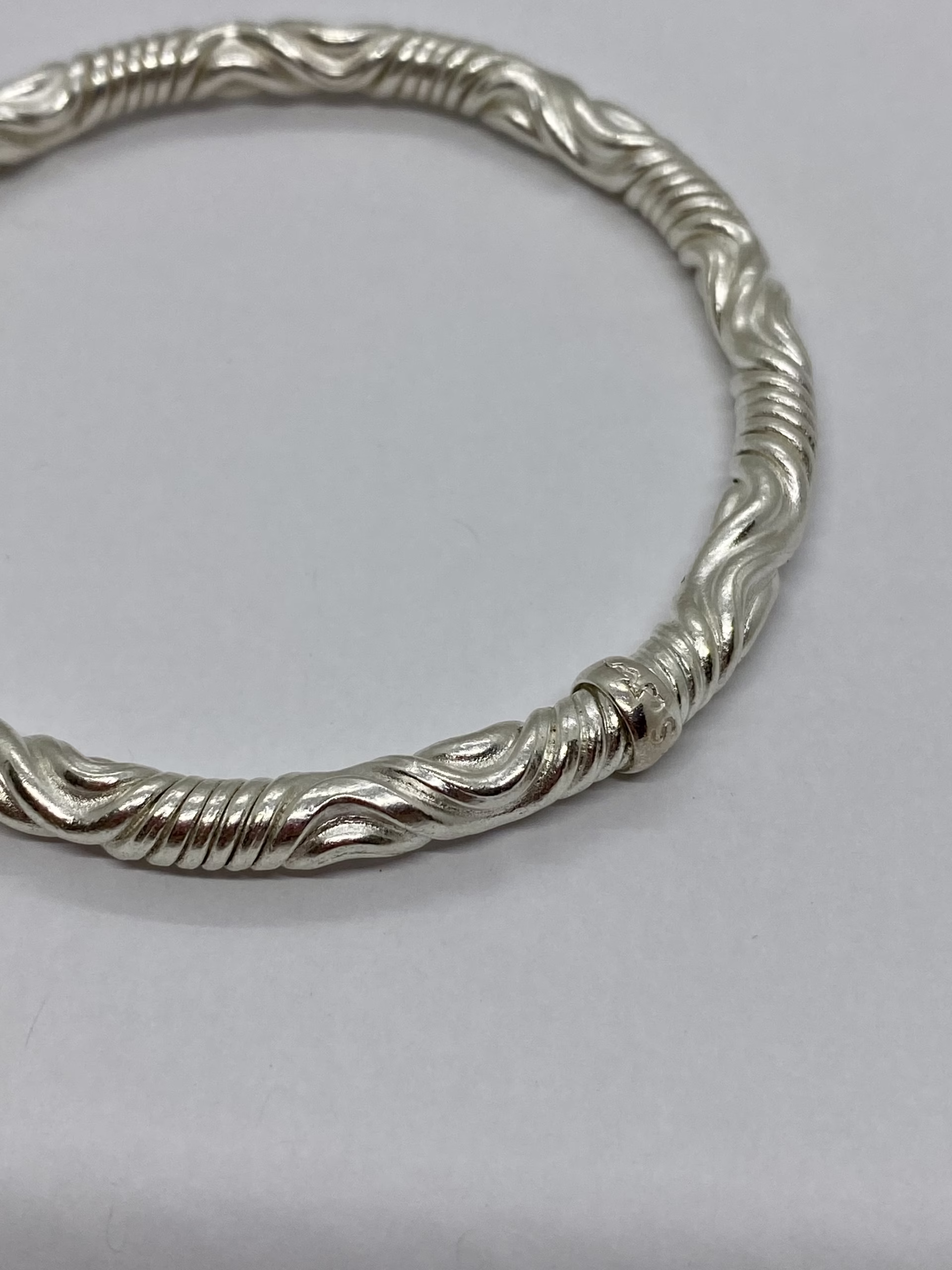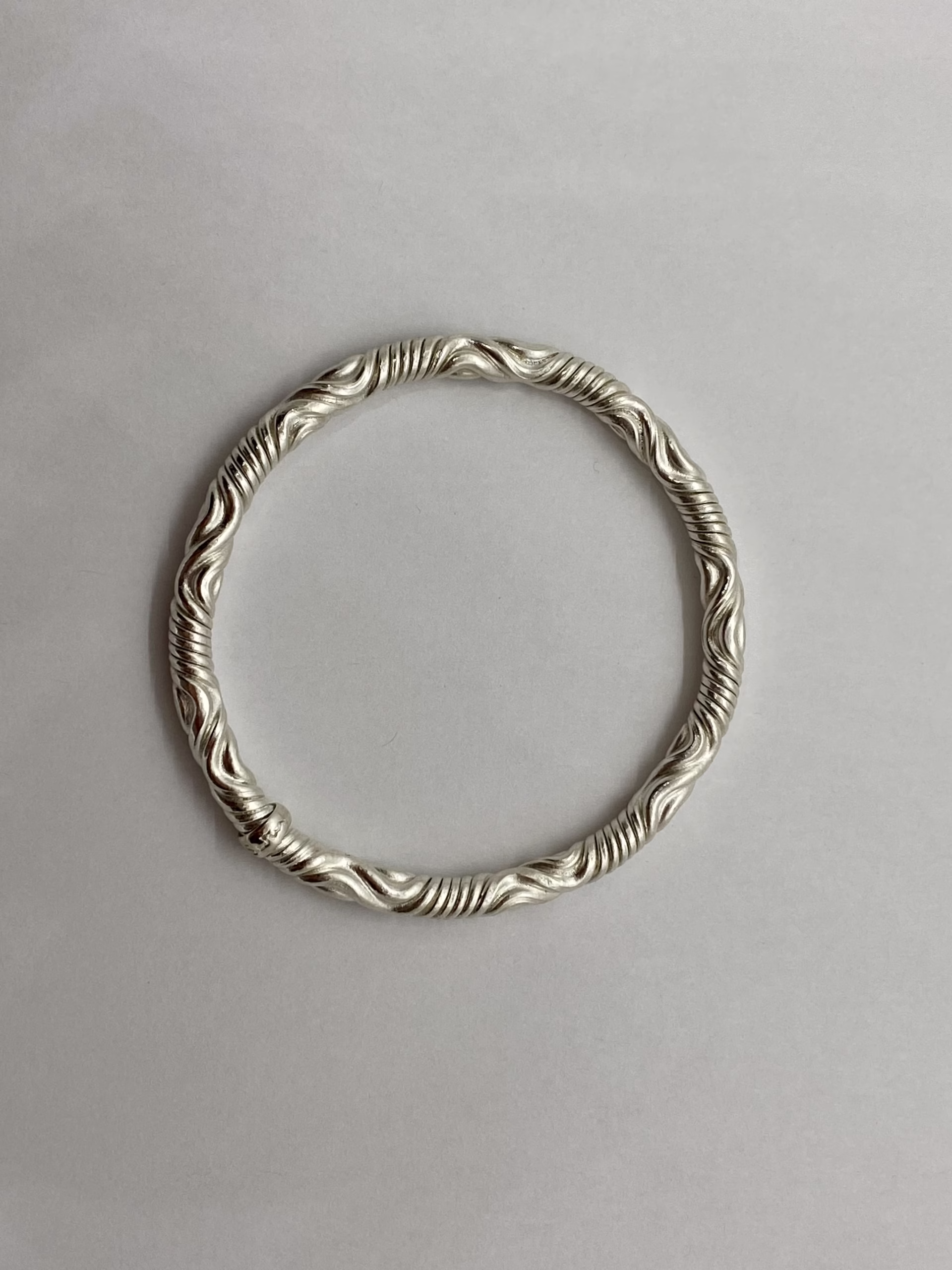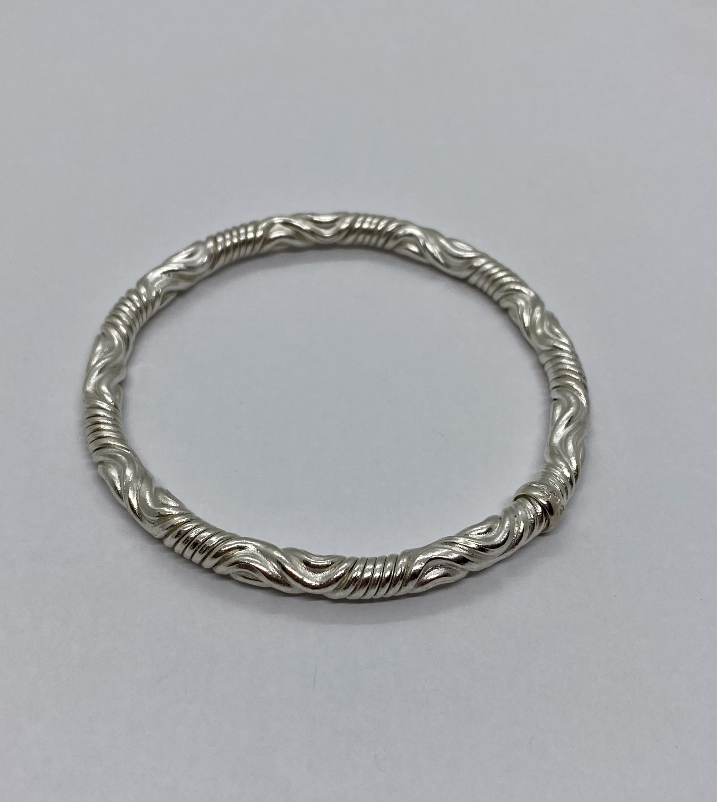 Handcrafted twist bangle by Jonathan Swan, created using his river machine. These are part of a series of prototypes, made with copper and then silver plated. Over time the higher surface will turn coppery, and the inlays will remain silver.