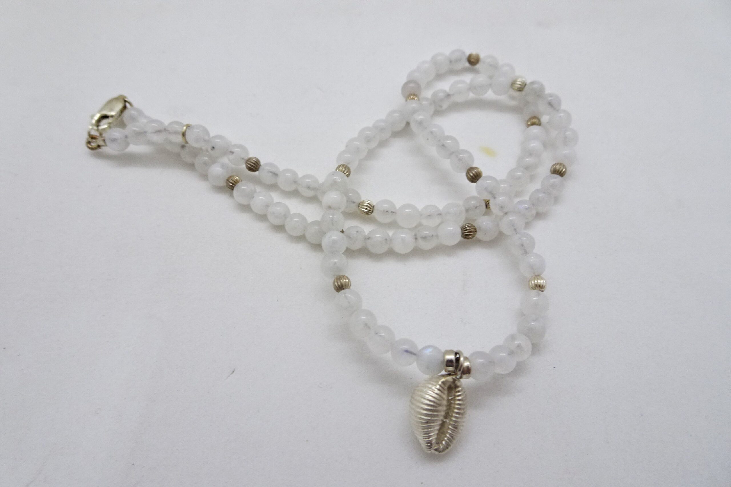 Julian Warrender’s silver cowrie with moonstone beads.18″ long.
