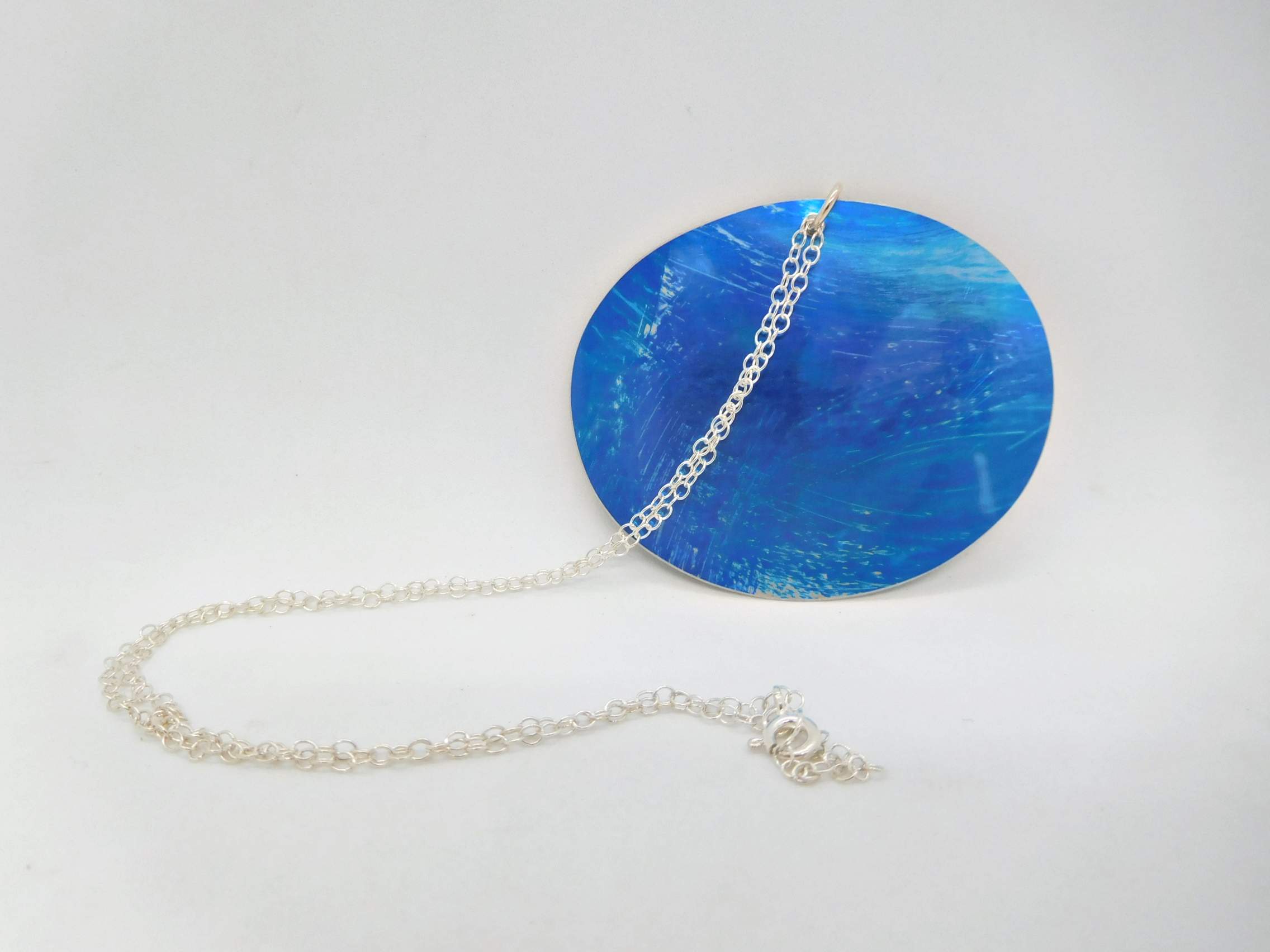 Miranda Peckitt’s silver chain with blue aluminium pendant/ Chain 16″. Oval 5.5 x 4.5cm