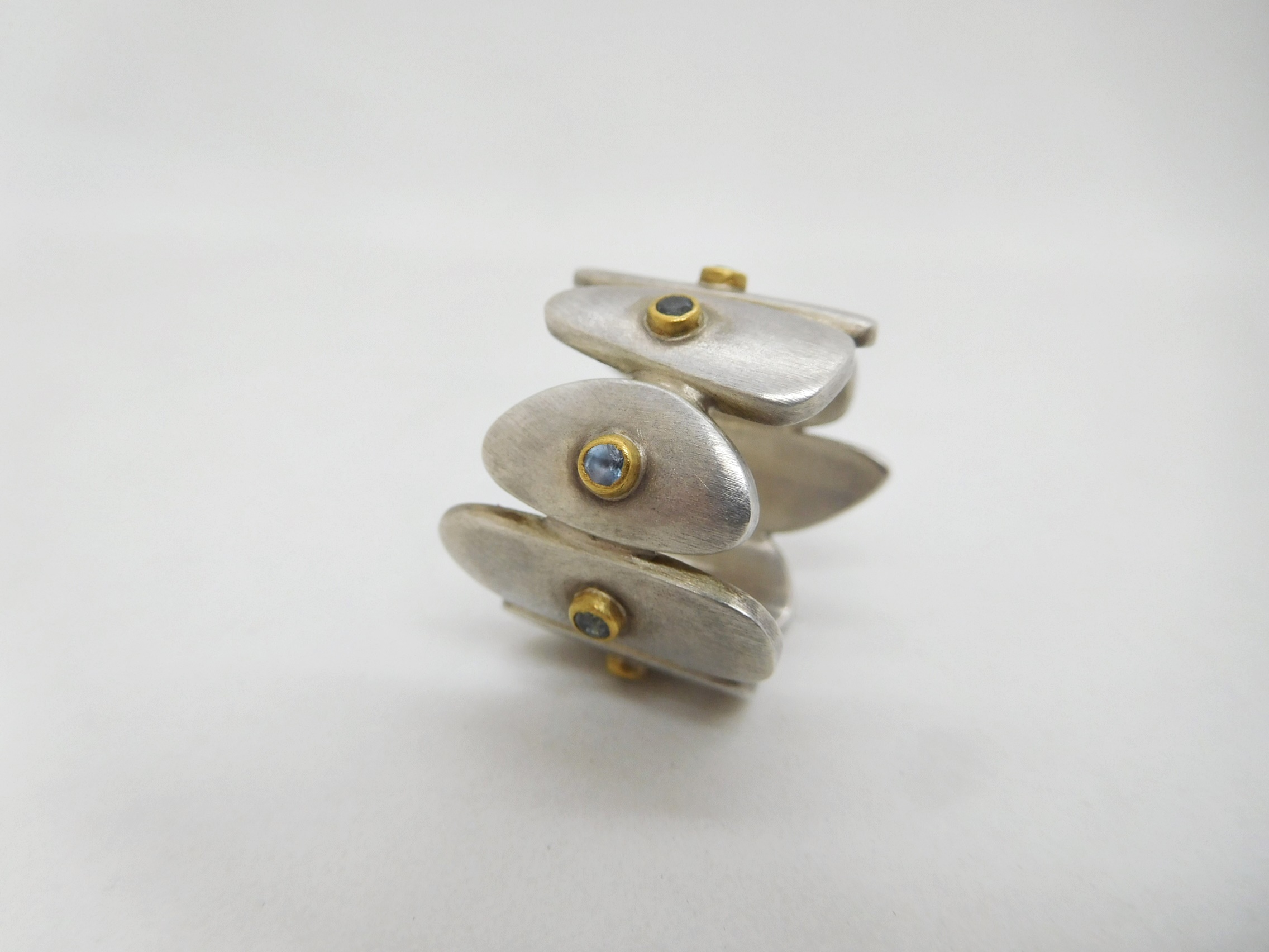 Silver assymetrical pebble ring with tiny aquamarines set in 9ct gold. Approx size O. (one off)
