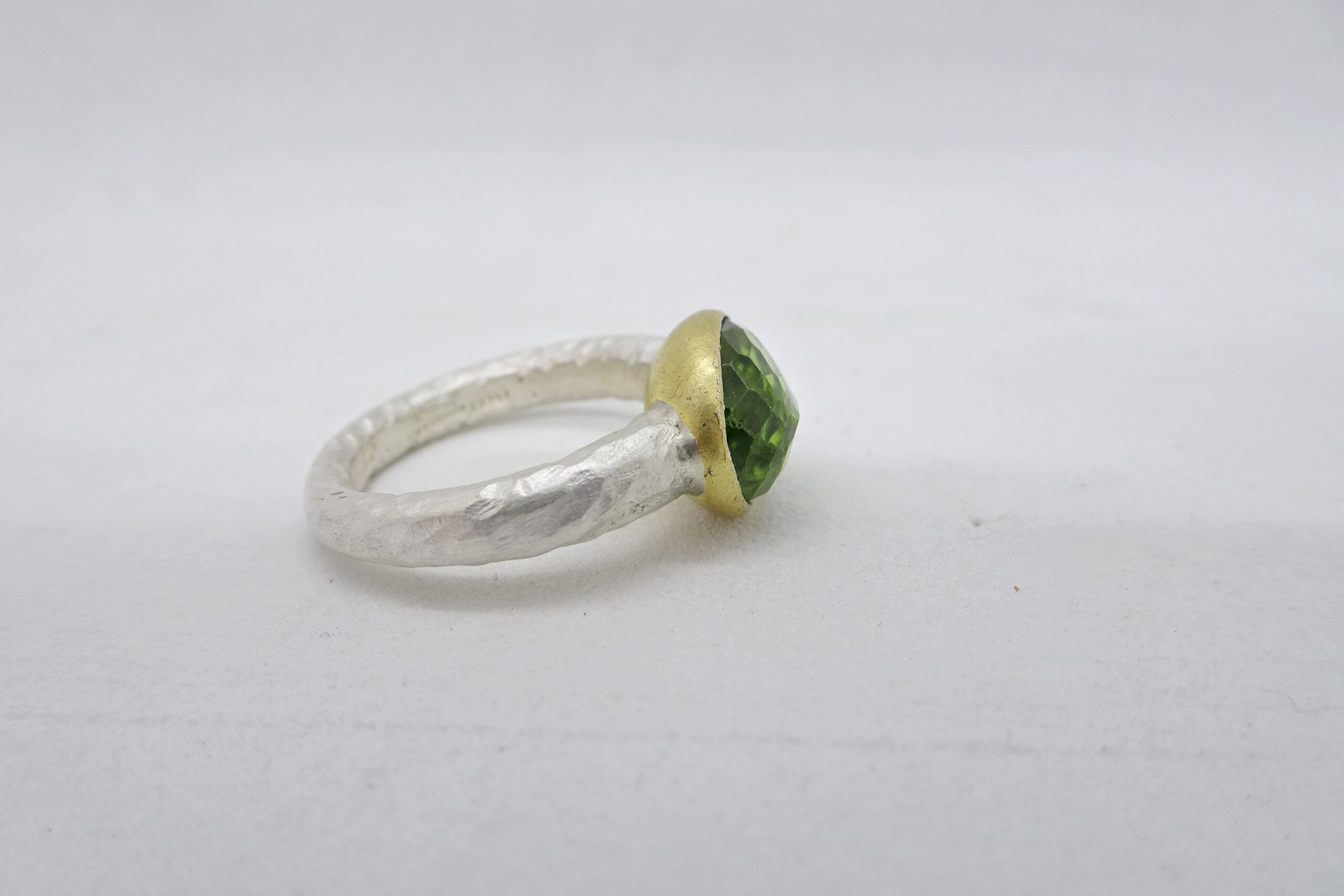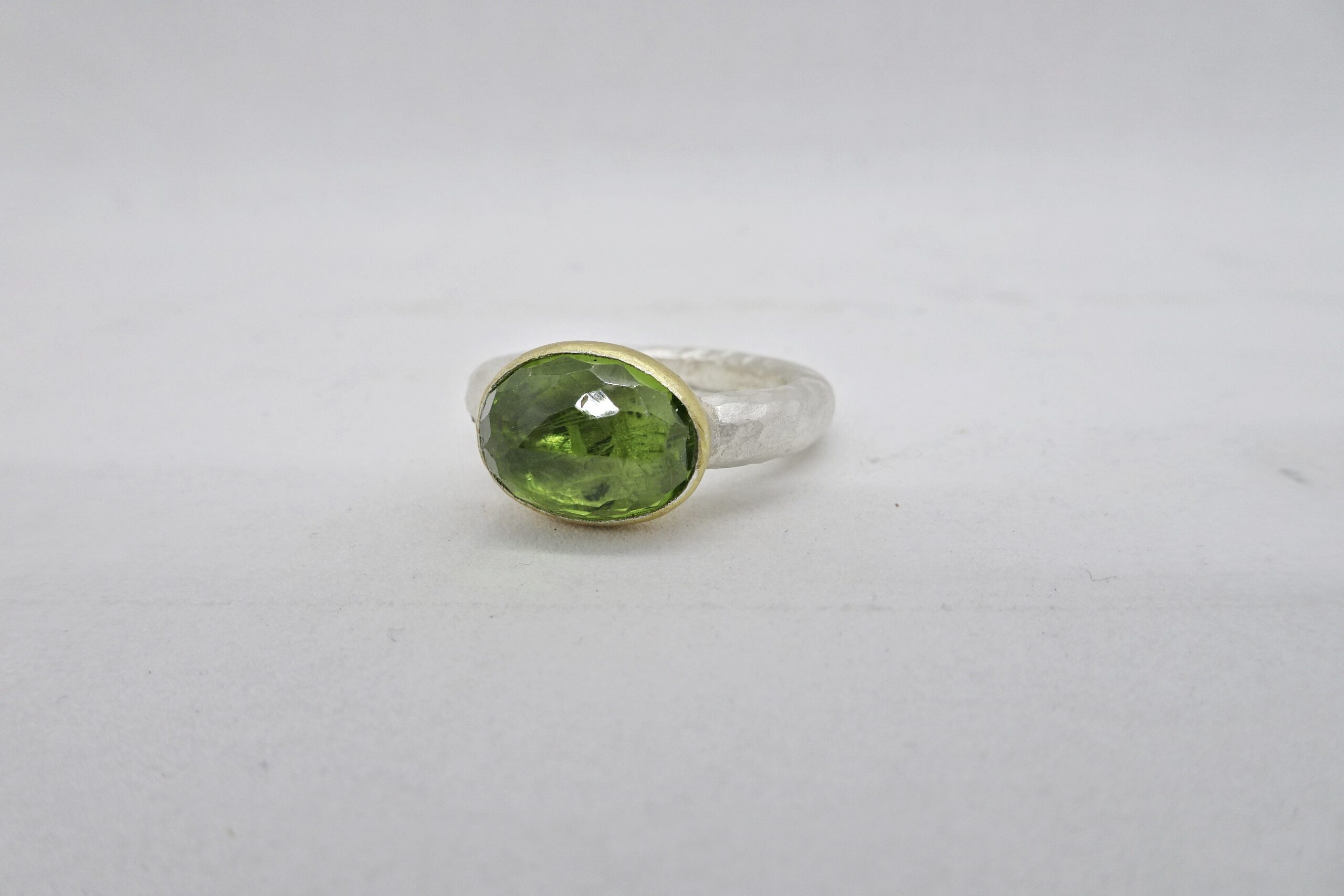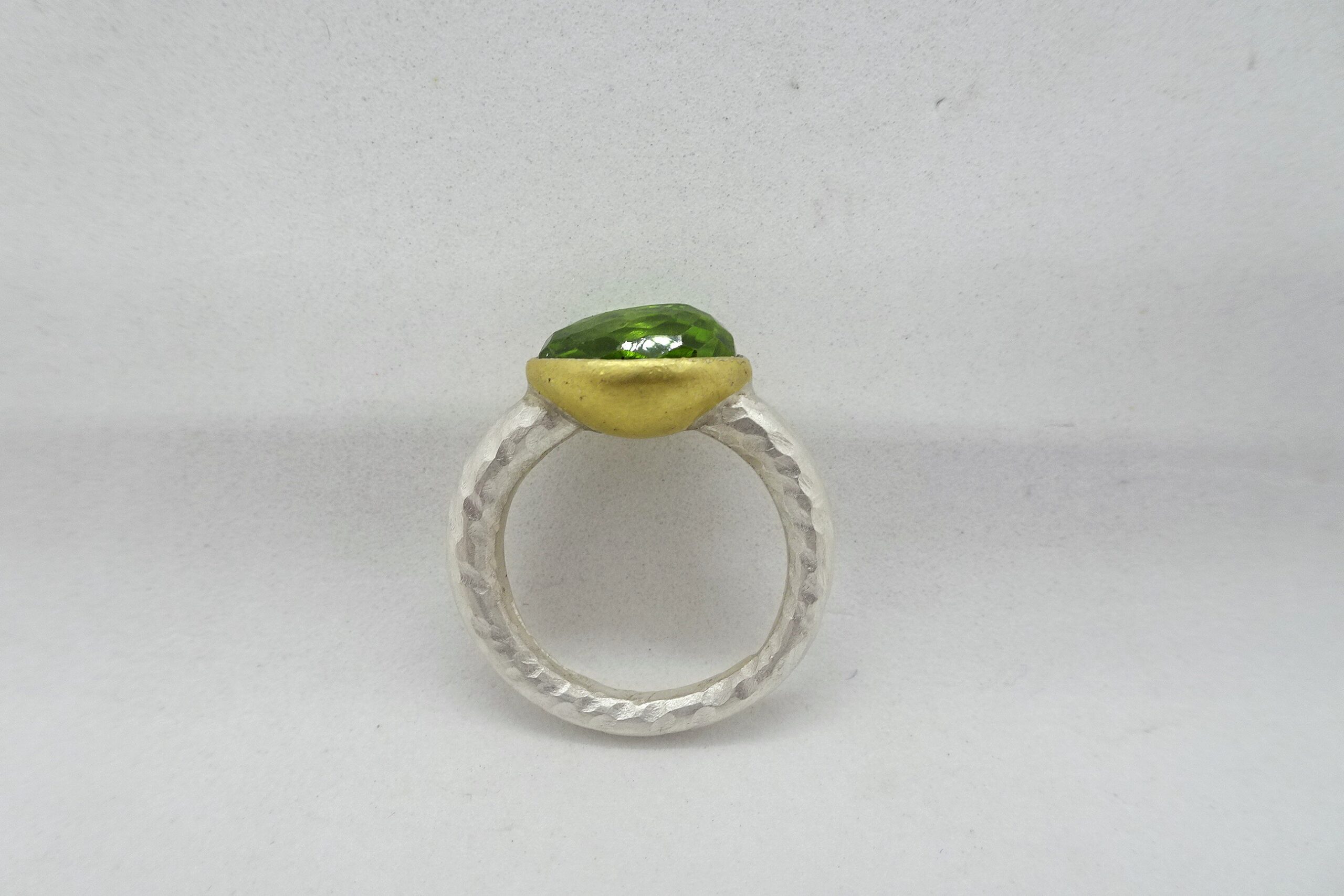 Poppy Dandiya’s peridot cup ring. Sterling silver with a layer of 24ct gold. Size M.