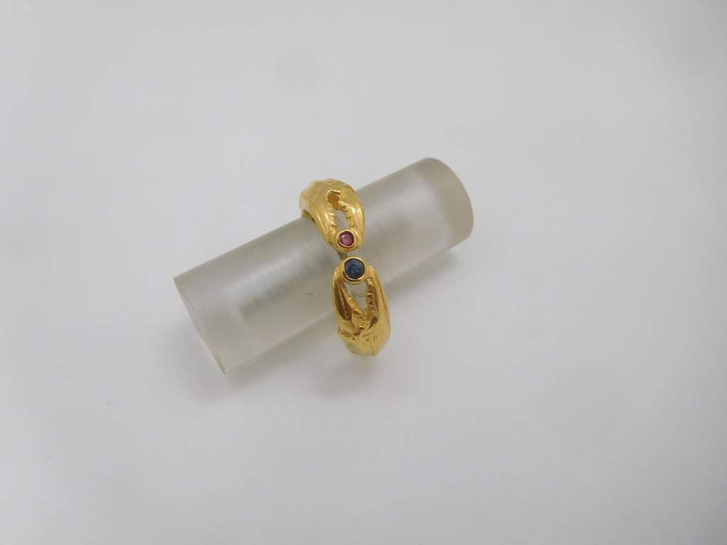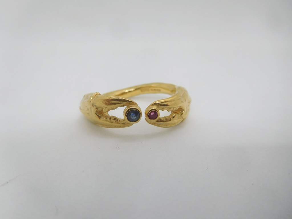 Veronique Pullen’s gold plated (22ct) cast crab claw ring with a ruby & a sapphire. Size N